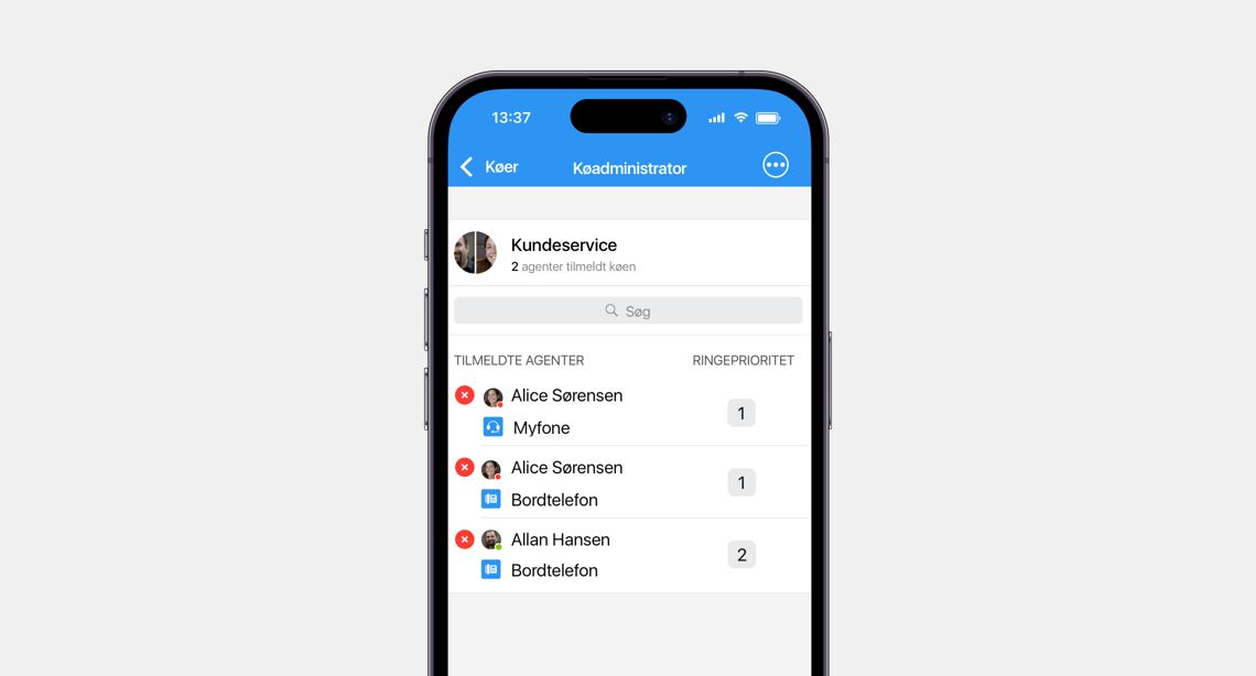 Du kan styre, hvilken af kollegaernes enheder der skal tilmeldes køen, og hvilken ringeprioritet de skal have. Med ringeprioritet kan medarbejdere f.eks. tildeles en lavere prioritet og derved fungere som en backup. Det vil sige, at de kun får kald fra køen, hvis alle med højere prioritet er optaget.